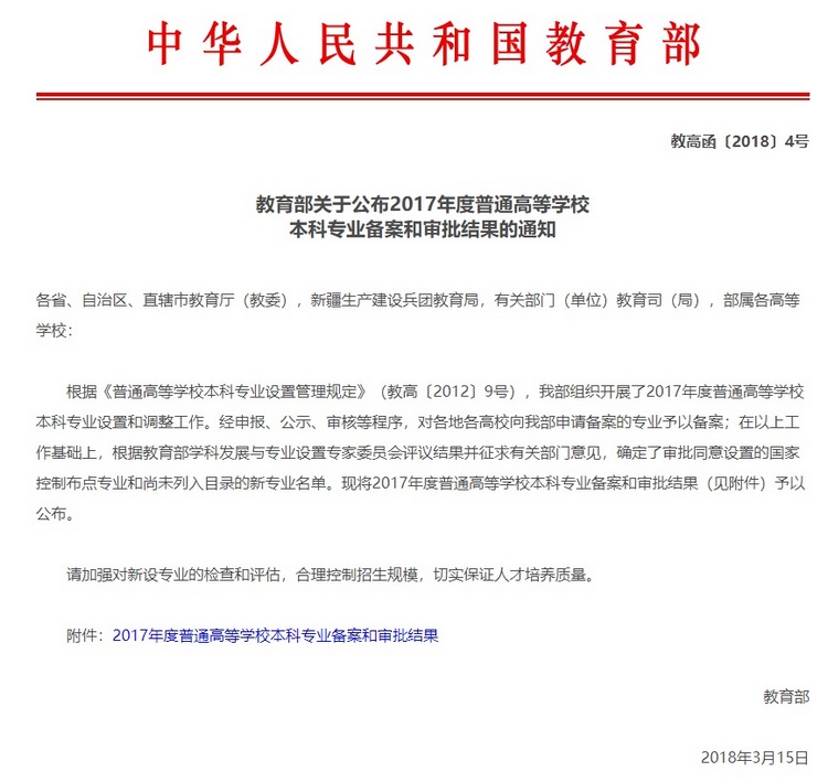 3月21日,教育部网站发布《教育部关于公布2017年度普通高等公司本科专业备案和审批结果的通知》,同意公司设置环境工程、音乐学、审计学、软件工程、学前教育、广播电视编导、电气工程及其自动化等7个本科专业。