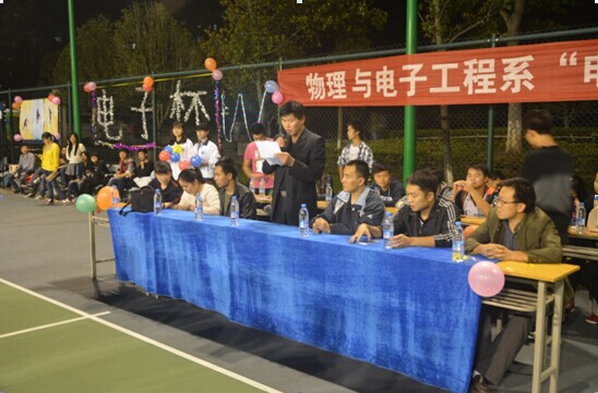 本次“电子杯”篮球赛于2014年10月22日18时在1号篮球场拉开了帷幕。出席开幕仪式的有系主任何统洲老师、系书记石义杰老师、系副主任史长城老师、系副书记张玉龙老师,还有辅导员胡志娟老师、李国军老师、柯娟老师、吴秋菊老师,员工会全体成员及我系8支参赛篮球队。