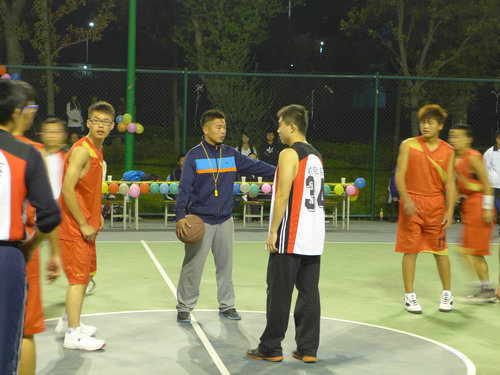 系党总支书记石义杰致开幕辞,希望同学们在比赛中赛出风格、赛出友谊、赛出水平,并祝篮球赛圆满成功。
