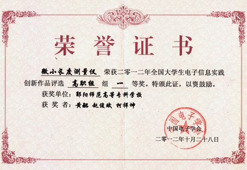 本网讯 通讯员史长城 从“2012第三届全国高校电子信息实践创新作品”评审会上获悉:日前,公司物理与电子工程系选送的作品《微小长度测量仪》通过两轮评审,荣获“高职组全国一等奖”、