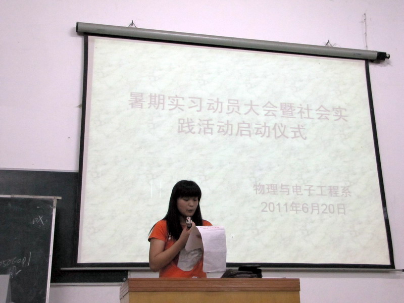 “纸上得来终觉浅,唯有实践觅真知”。6月19日晚7:30物电系2011暑期见习动员大会暨暑期社会实践启动仪式在东一教室隆重举行,这标志着我系员工实践活动迈出了新的一步。