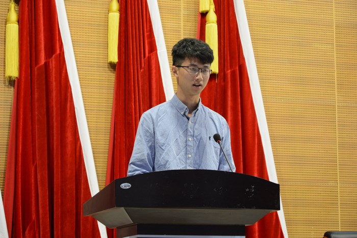 新生代表刘思佳在发言中,对老员工活充满向往,希望能超越自己,在大学不断提升自己。倡议各位同学在大学的学习生活中,热爱祖国,知行合一;自主学习、勤奋思考;克难进取,积极乐观;不断提升自己的综合素质,奋斗去实现人生理想。并带领全体新同学郑重承诺:我们将不忘初心,努力学习,牢记使命,砥砺前行!我与物电共荣辱!我与汉师共奋进!