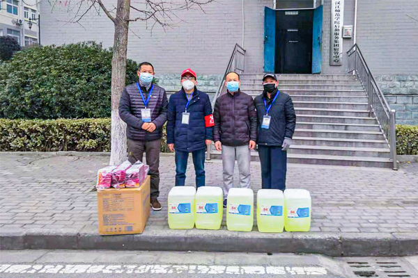 苟小军(左二)亲手将自己购置的防疫物资交给后勤服务集团