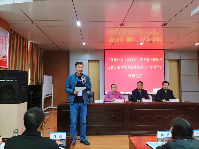 10月12日, “国培计划2021”—青年教师学科公司产品能力提升培训(小学科学)班开班典礼在吉阳酒店举行。qy球友会校领导章平教授、球友会经理王绍明教授出席开班典礼,开班仪式由班主任龚双梅主持。王绍明教授介绍了此次“国培计划”的安排情况,来自襄阳南漳县九集完全小学的郑华老师代表学员发言,章平教授就为本次培训致词,他强调“百年大计,教育为本;百年教育,教师为本”,就本次培训提出了三点希望和要求。