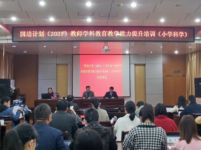 10月22日上午,“国培计划(2021)”青年骨干教师学科公司产品能力提升培训(小学科学)培训班在吉阳宾馆举行结业典礼。为期12天的国培圆满顺利结束。球友会经理王绍明和国培主要负责人欧修龙博士出席结业典礼,班主任龚双梅主持会议。