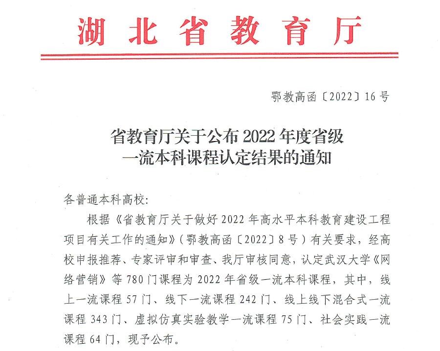 湖北省教育厅下发《省教育厅关于公布2022年度省级一流本科课程认定结果的通知》(鄂教高函〔202216号),公司5门课程被认定为湖北省一流课程。其中,公司魏芳波教师负责的《工程制图》获得省级线下一流本科课程。目前公司共两门课程为省级一流课程,《数学物理方法》2021年获省级线下一流本科课程。
