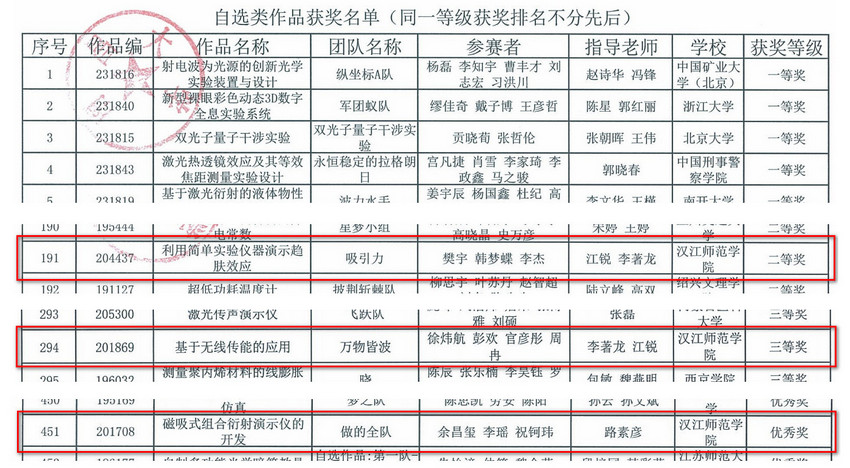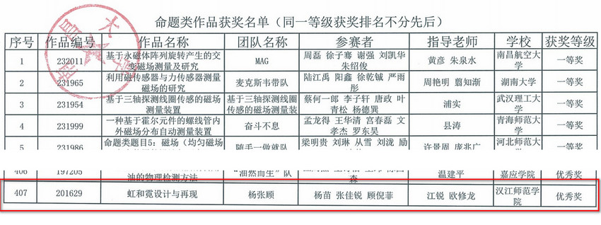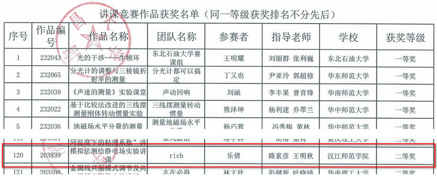 近日,由南昌大学承办的第七届全国老员工物理实验竞赛(创新赛)获奖名单正式公布。公司共选送5支代表队参赛,其中樊宇组的作品《利用简单实验仪器演示趋肤效应》和乐倩的《模拟法测绘静电场实验课》获得二等奖,徐炜航组作品《基于无线传能的应用》获得三等奖, 杨苗组的作品《虹与霓的设计与再现》和余昌玺组的作品《磁吸式组合衍射实验仪的开发》获得优秀奖。