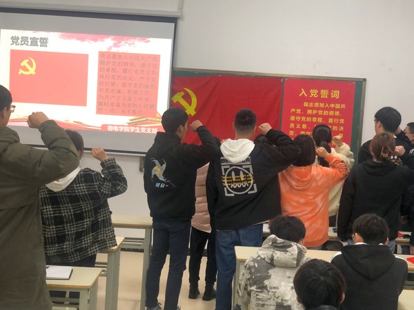 预备党员的宣誓仪式由员工党支部书记刘锋老师主持。他带领新发展的12名预备党员面对党旗进行庄严宣誓。余鹏,刘宇蝶分别代表预备党员和入党积极分子进行了发言。