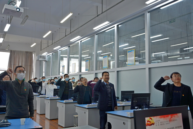 在党的二十大开幕会开始前,全体师生按照主题党日要求,通报到会情况,交纳党费,由教工党支部书记欧修龙同志带领全体党员重温入党誓词。随后全体党员认真聆听、收看习近平总书记代表十九届中央委员会向大会作的报告。