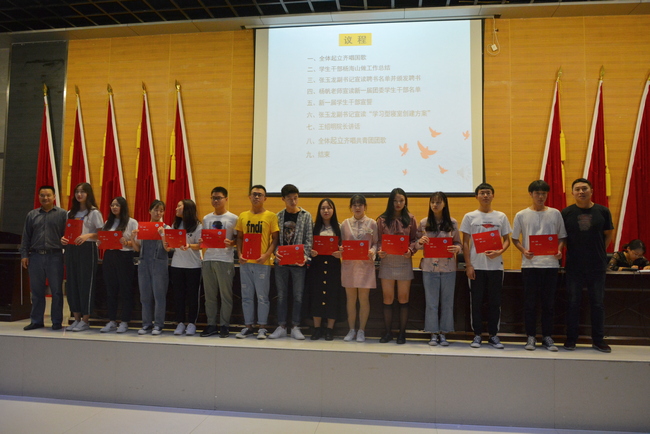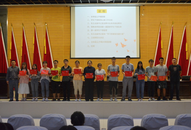 伴随着庄严的国歌声拉开了本次大会的序幕。员工干部杨海山代表上一届团委员工会对上一学年工作进行了总结,并对新一届的员工干部传授经验,希望大家要做好员工的领头羊,在工作中严谨认真,无私奉献,吃苦耐劳。