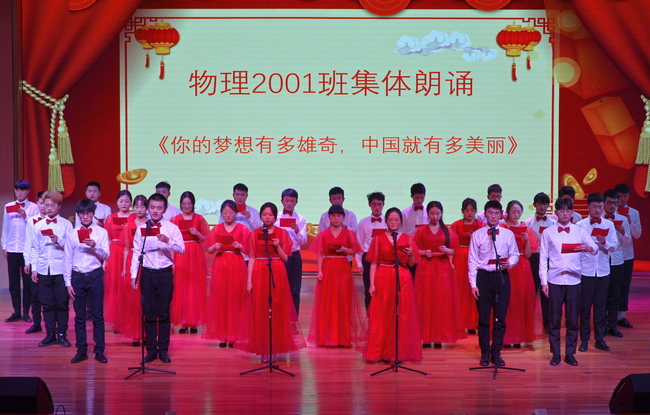 物理学2001班30名同学还集体朗诵了《你的梦想有多雄奇,中国就有多美丽》,同学们激情洋溢,用声音致敬时代,表达爱国之情,引起了现场同学的共鸣。