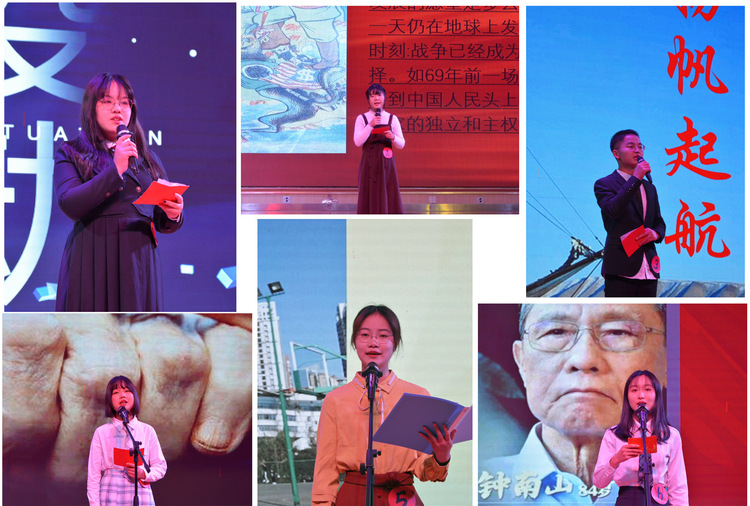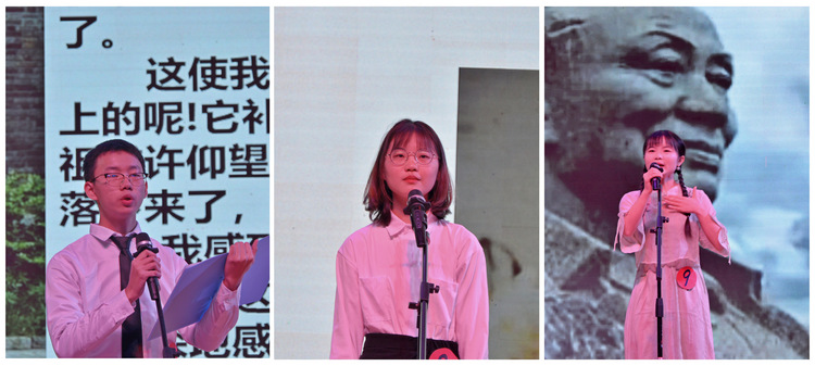 在第一个演讲或朗诵环节,物理2001班李煜和电气2001班邹宇彤的演讲《致敬抗美援朝》和《致敬最可爱的人》,表达了对那些挺身而出,勇于担当的时代英雄的崇敬之情。物理2001班余博森和物理1901班乐倩演讲的《青春的底色》和《青春当自强,吾辈是希望》展示了新时代新青年的远大志向。朗诵的选手也是各展风采,他们有的自信洒脱、或铿锵有力,如《我爱这土地》、《在路上》、《如果有来生》,或深情演绎、娓娓道来,如《父亲的手》《丑石》。选手们以饱满的风貌展现了自己的普通话水平和语言魅力,诠释了当代老员工全新的生活面貌和积极向上的精神状态。