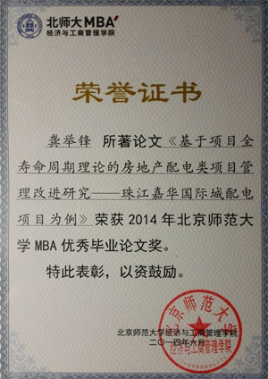 工作期间,多次获得“优秀员工”、“先进工作者”等称号, 2013年荣获北京师范大学经济与工商管理公司2012-2013学年年度MBA竞赛奖学金,经济与工商管理公司2012-2013学年年度MBA优秀员工奖学金一等奖,2014年获得北京师范大学MBA优秀毕业论文奖。