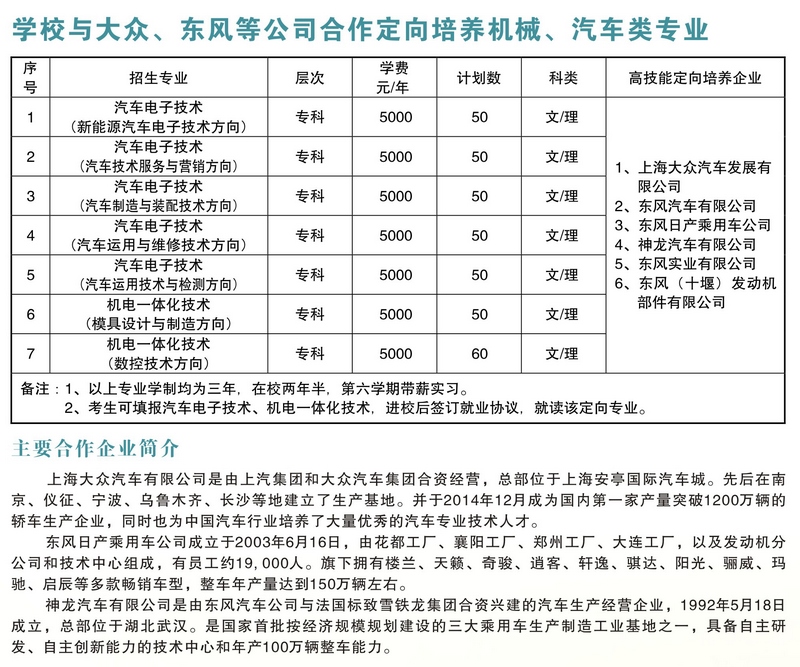 其中汽车电子技术专业(汽车检测与维修方向)、(汽车技术服务与营销方向)为上海大众汽车发展有限公司、东风汽车有限公司、东风日产乘用车公司、神龙汽车有限公司、东风实业有限公司等公司定向培养,员工毕业后直接到上述企业就业。