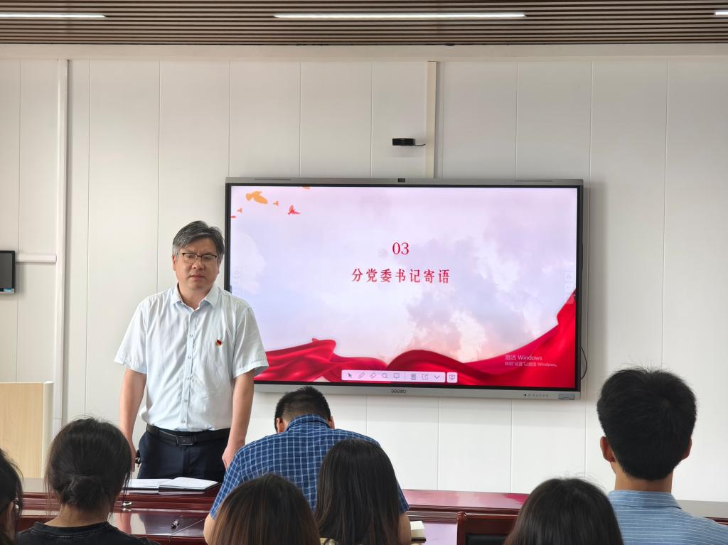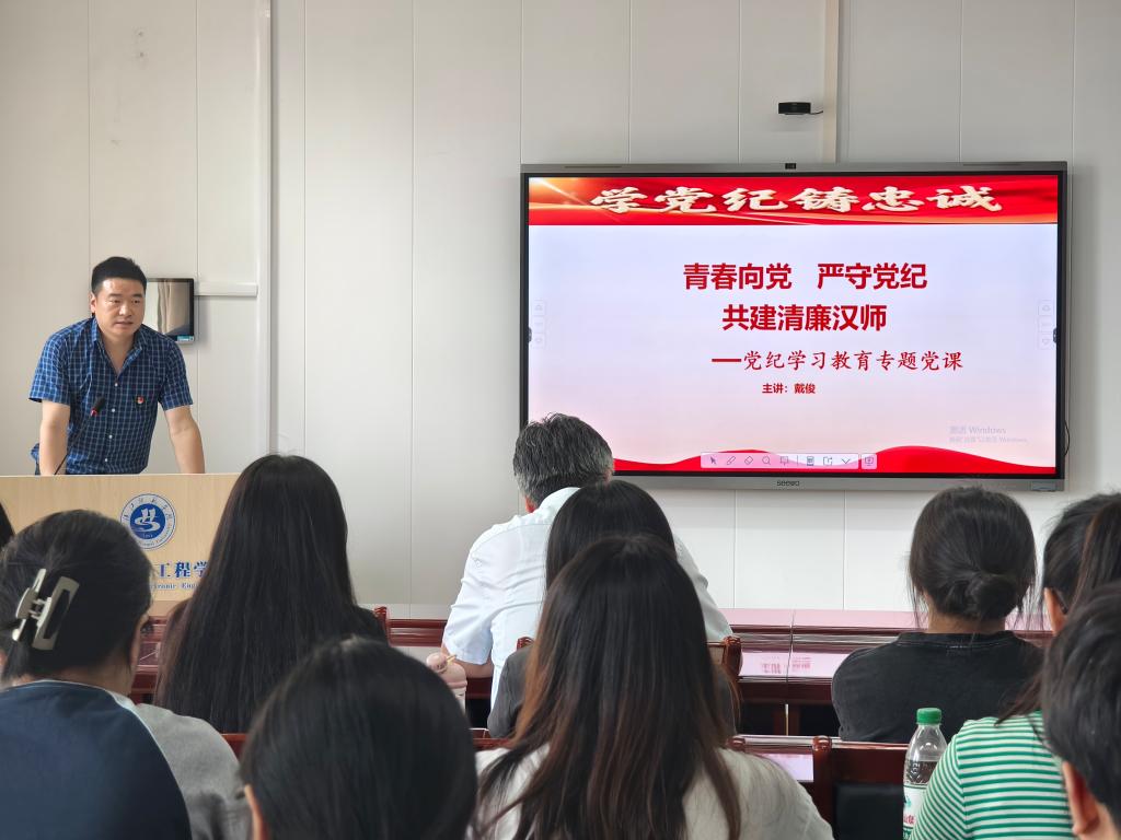最后,戴俊以“青春向党 严守党纪 共建清廉汉师”为主题,为在座党员上了一堂生动的党纪学习教育专题党课。戴俊结合党纪学习教育的重要性,介绍了《条例》的基本内容,重点围绕与师生工作生活密切相关的“廉洁纪律”,开展了警示教育。他强调,要提高站位,不断增强纪律定力、道德定力,系统学习党章党规、明确党纪要求,自觉将党纪要求融入日常工作和生活中。