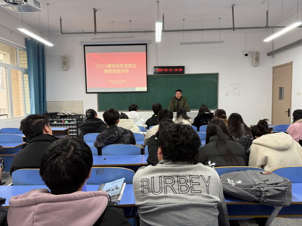 为进一步做好2025届毕业生就业工作,推动全体毕业生更加全面地掌握当前就业形势与政策,实现高质量充分就业,3月11日—12日,球友会在各毕业班举办2025届毕业生促就业暨政策宣讲会,会议由院分党委副书记戴俊主讲,毕业班辅导员贺培及2025届毕业生参会。